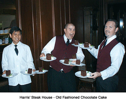 Cake with white chocolate anglaise. Harris' is a great Steakhouse