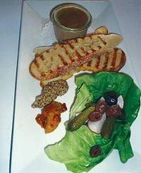 smooth chicken liver mousse served with toast, relish, olives,