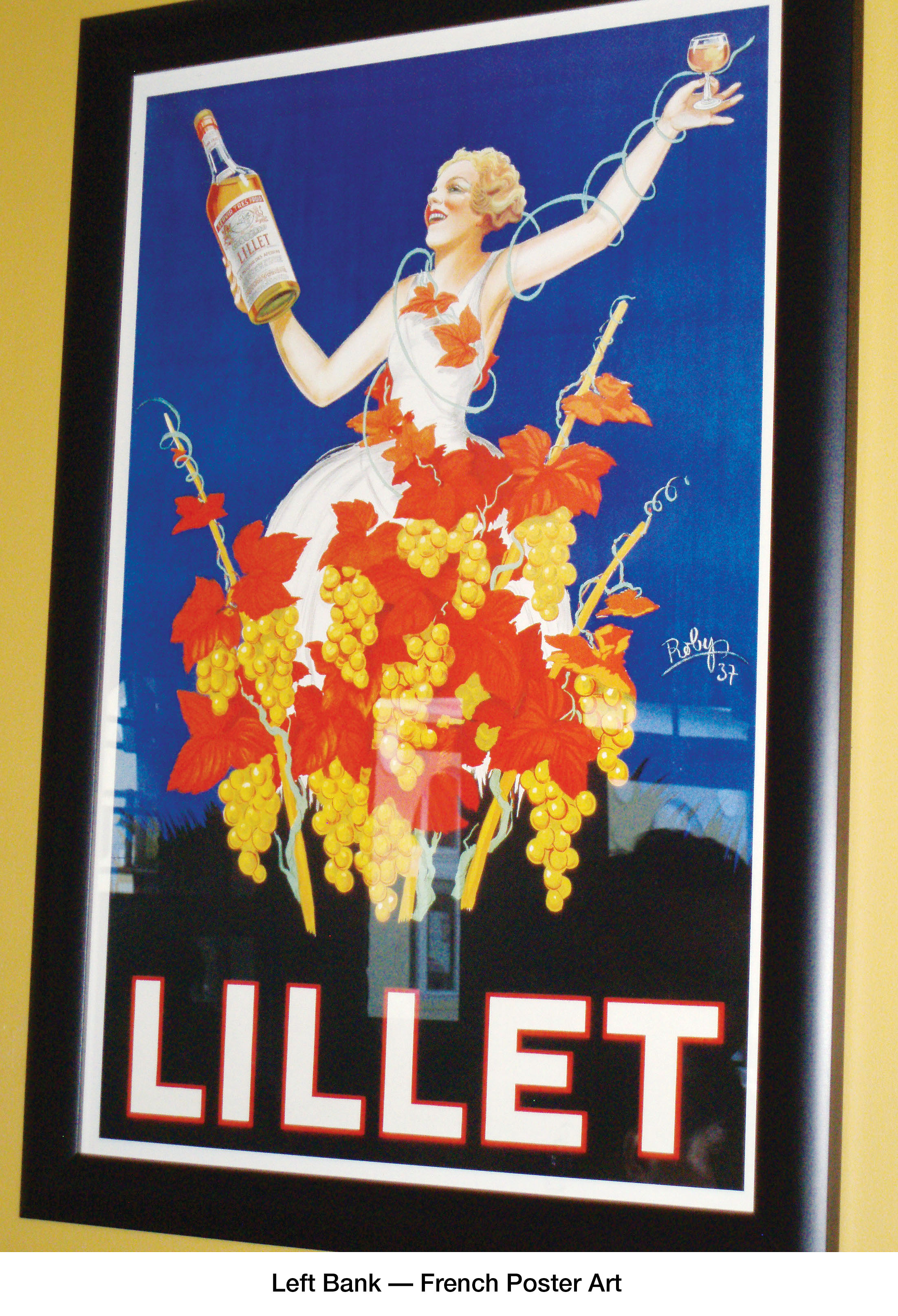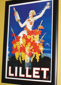 stone fireplace, mahogany bar and colorful French Poster Art.