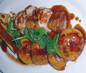 This was a delicious roasted duck breast with peaches, chickpea