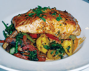 Au Vin, Moules and Frites, Steak Frites, Salmon and Braised Peppered