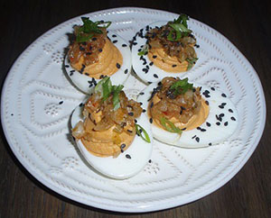 Jidori Eggs topped with Korean Chili and Kimchee which added