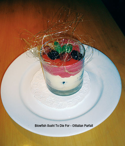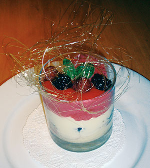 crunchy bits of sable, topped with fresh blueberries frothy raspberry