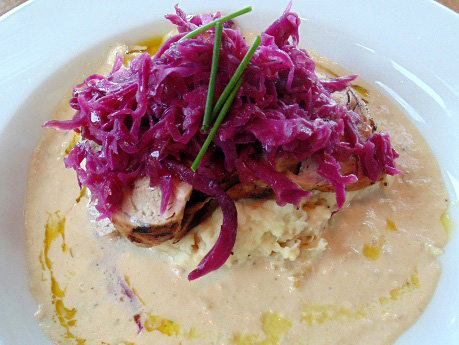 red cabbage and apple, served with smashed Yukon gold potatoes