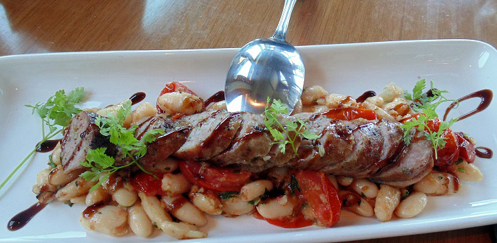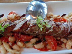 grilled Sicilian sausage with buttered white beans, roasted grape