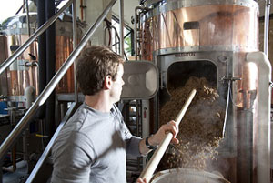 Kevin Clark making ale in huge copper vats within a glass enclosed