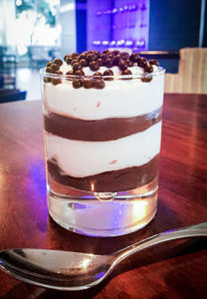 Layer chocolate mousse and vanilla ice cream in a rocks