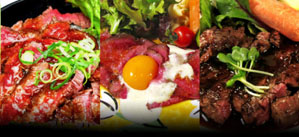 a raw egg yolk, peppered yogurt sauce, and a sweet soy sauce