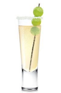 Pour vodka into a white sugar rimmed flute and top with