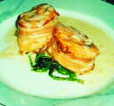 presentation of Roasted Pancetta Wrapped Herbed King Salmon, topped