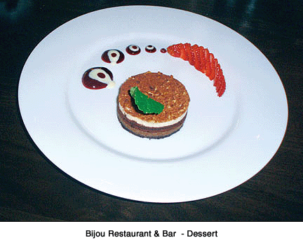 Cake with white chocolate anglaise. Harris' is a great Steakhouse