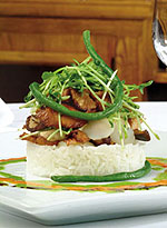Place hot jasmine rice in center of plate using 4" cake ring. Place mushrooms, pea sprouts, tofu on top and remove cake ring. Drizzle hot sweet chili sauce around plate. Drizzle cilantro oil and sweet soy around plate. Serve.