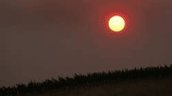 from wildfires makes the sun look red as it sets over a vineyard