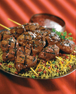 Lift meat from marinade and drain briefly (reserve marinade). Thread